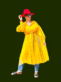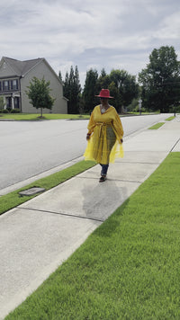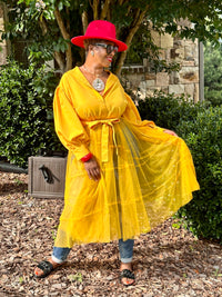This mustard color blouse top with mesh bottom cover skirt dress is to shop for. She's a classy feel with a long mesh bottom that drapes to give that skirt/dress appeal. Of course she can be dressed up with a nice pair of slacks or leggings if you choose to. She can also be paired nicely with denim jeans or shorts. Put on your favorite pair of heels or flats and slay the day.
